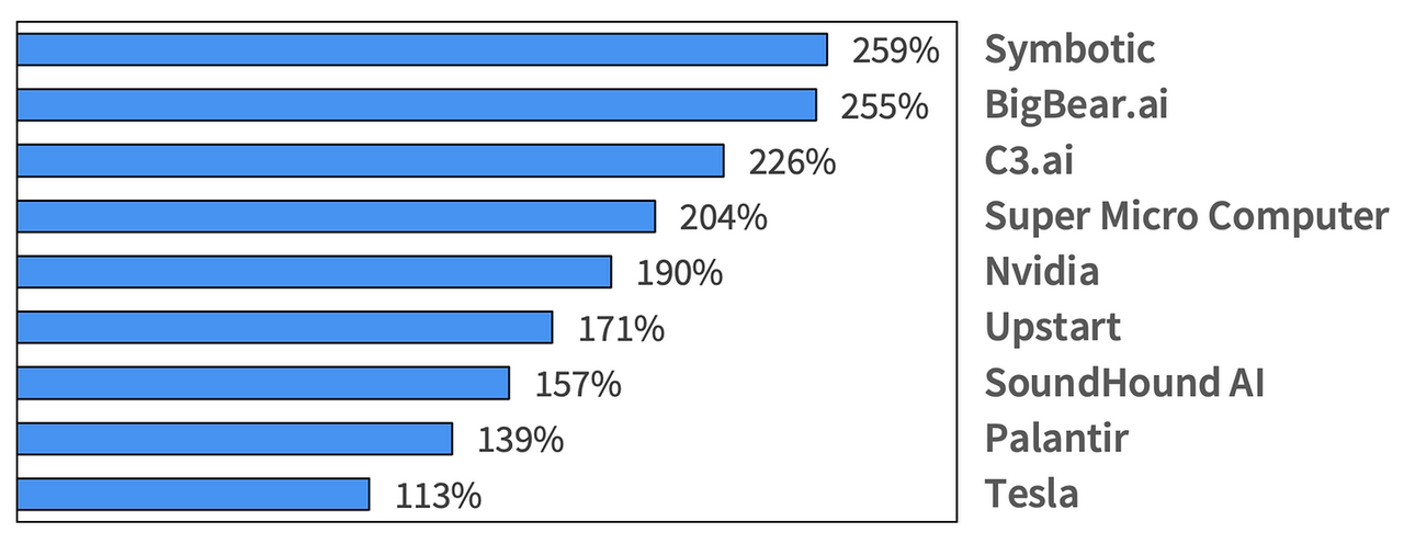 没有人不相信 AI 带来的改变会是货真价实的。但是,AI 概念股的涨幅之快也令人咂舌。下图是 2023 年初至 6 月 30 日,半年时间里部分 AI 概念股的回报水平: