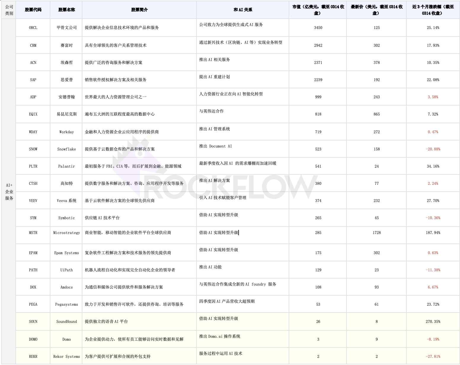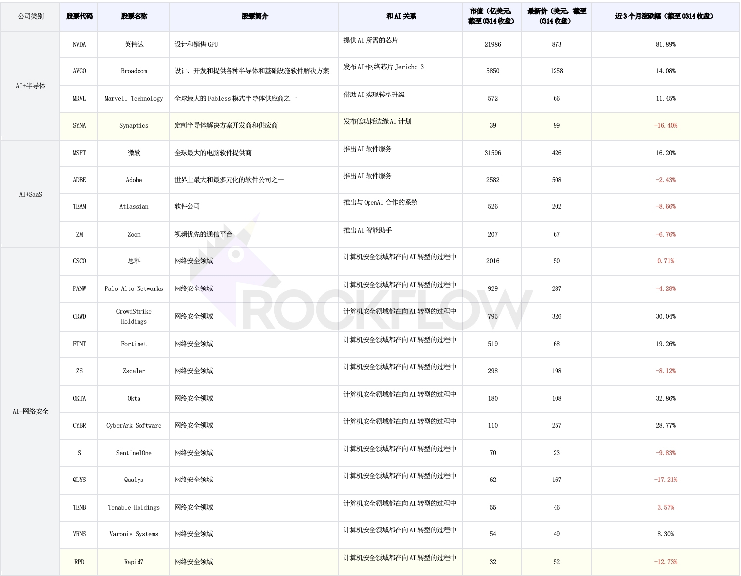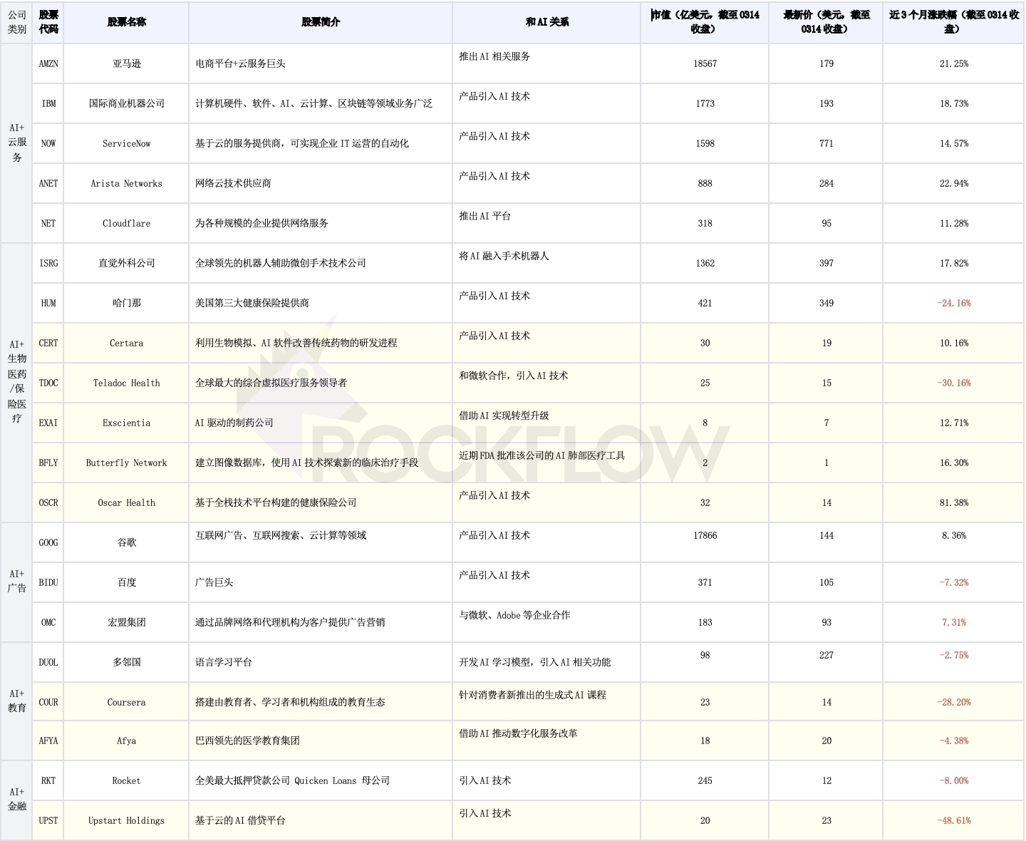 另外,RockFlow 投研团队也专门梳理了九类美股市场仍有潜力的 AI 概念股(分别涉及半导体、SaaS、网络安全、企业服务、云服务、生物医药/保险医疗、广告、教育、消费金融),包括它们近期表现也一并列出,便于大家比对(淡黄色的为市值小于 $50 亿的股票):
