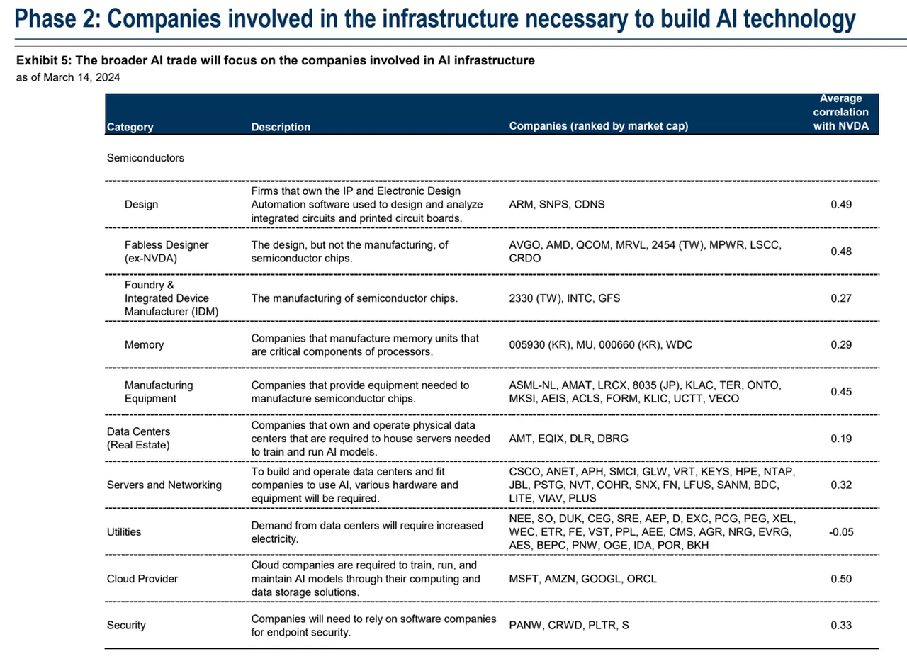 第二阶段,关注英伟达之外的 AI 基础设施,包括半导体企业、云服务提供商、数据中心REITs、硬件和设备公司、软件安全股以及公用事业公司;