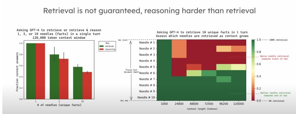 在Langchain最近的研究中,他们设置了多个探针后发现,即使是支持长上下文的模型,在探针越多的情况下,其正确召回率仍然会衰退,而且对探针的推理能力衰退的更明显。所以,当前的方法下大模型可能能记住很长上下文,但懂多少,能用多少还是存疑的。