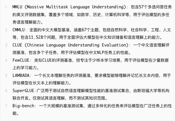 所以,在这样“卷”的大模型市场,kimi究竟为什么会火?其实它的火爆,也从侧面反应了大模型市场的痛点,过去一年,市场见到了太多大模型的发布,每次标准动作有以下几个:1、公布模型参数量;2、公布模型是开源还是闭源;3、公布测试集的成绩(这些测试集被用于评估大模型在不同领域的能力,包括语言理解、知识问答、文本创作等。通过这些测试集,研究人员和开发者可以比较不同模型的性能,并识别模型的优势和不足,具体测试集的测试功能,如下图所示)。4、行业内人士或极客们的评测文章。