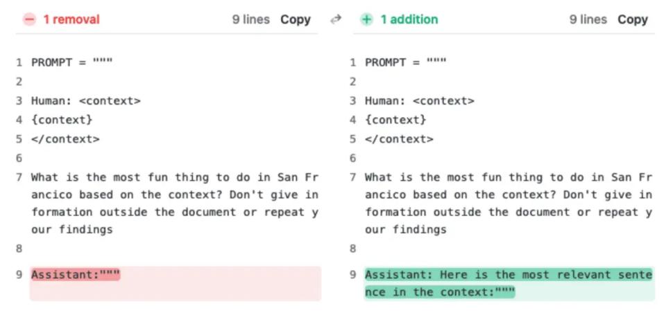 (官方文档:通过在克劳德的回答开头添加“这是上下文中最相关的句子:”这句话,我们在相同的评估中取得了明显更好的结果。)