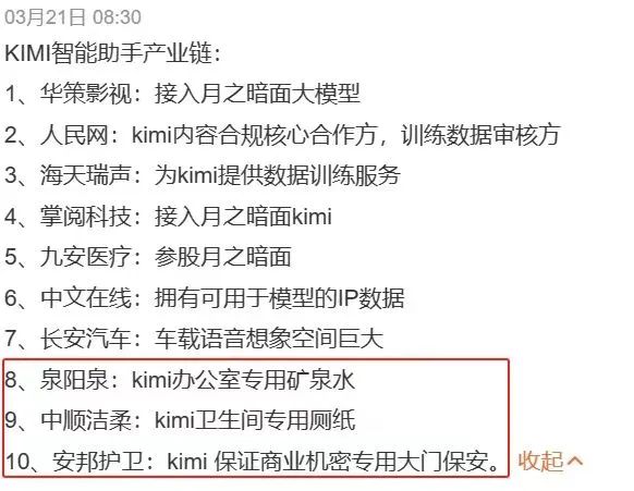 这是这波AI浪潮中,国内创业公司第一次真正“破圈”。最明显的标志是,在二级市场中,Kimi已被市场作为一个概念板块来对待,它们被称之为“Kimi概念股”。在之前爆炒的板块中,可能有华为产业链、苹果产业链,但是,因为一家创业公司而发酵一波行情还是第一次。
