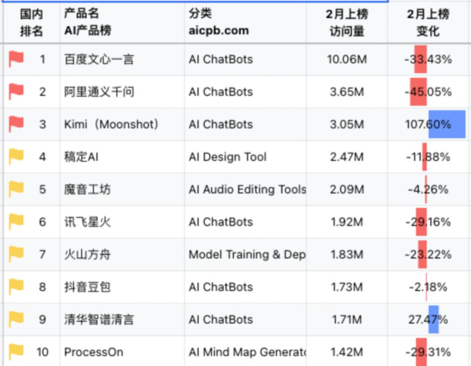除了资本市场的关注,实际的用户量飙升,也能看出kimi的火爆程度。在“AI产品榜(aicpb.com)”统计的数据显示,Kimi智能助手在2024年2月的访问量达305万,较上个月增长107.6%,几乎成倍增长。