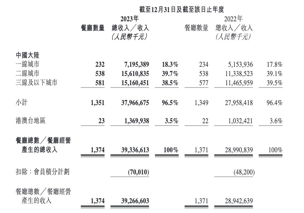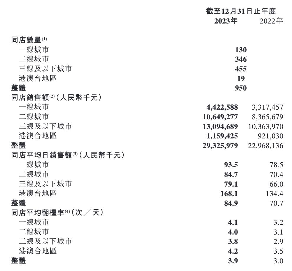 2023年,海底捞的餐厅数量相比2022年没有太大变动,餐厅收入增长主要是由同店销售额增加贡献的,其中一线城市整体同比增幅较大,这是由于一线城市门店数较少基数较低,同时翻台率更高;二三线城市门店则贡献了更多的绝对营收增长。