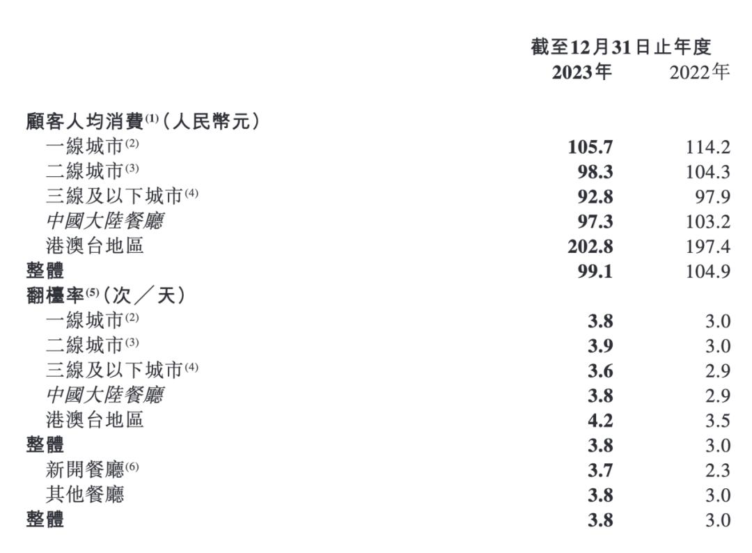 海底捞的选择是给用户提供更多优惠。财报显示,2023年,海底捞一线城市顾客人均消费从2022年的114.2元降至105.7元,整体顾客人均消费从2022年的104.9元下降至99.1元。财报指出,人均消费下降主要是由于优惠增加。