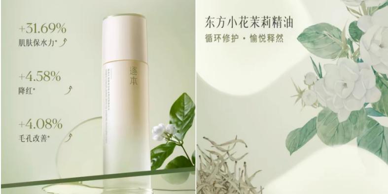 例如,逐本在产品不染小清茶水乳中,加入了小花茉莉、金银花以及普洱三种东方茶提取的精油,在修护肌肤屏障的同时,也能让用户在护肤过程中嗅到植物精油中的自然香气,从而感到放松治愈。