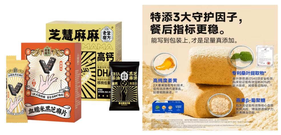另一方面,新中式也为中老年产品创新提供了新思路。例如,以糖尿病人群为特定用户的品牌糖友饱饱在其新品“糖友馒头”里添加了新中式成分“高纯度姜黄”和“专利桑叶提取物”,能够起到改善代谢紊乱、阻断碳水吸收的作用。