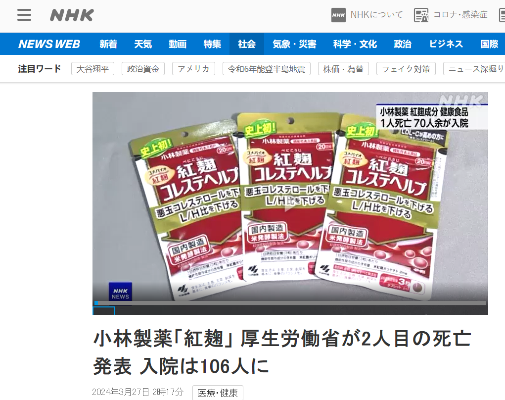 3月28日,小林制药对外表示,服用公司旗下红曲成分保健品“红麹胆固醇颗粒”而死亡的病例已达4人。