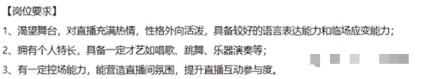 有意思的是,这则实习招聘在岗位要求里还额外提到了,希望实习生“拥有个人特长,具备一定才艺比如唱歌、跳舞、乐器演奏等”。