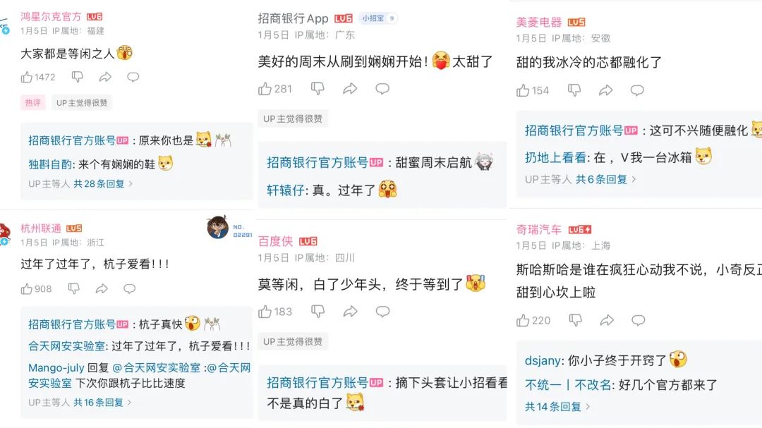 招行小姐姐简直就是公司的野生代言人,八妹觉得请明星也不一定有她这么强的号召力,年初的视频发布后,评论区炸出了超多企业的官方账号: