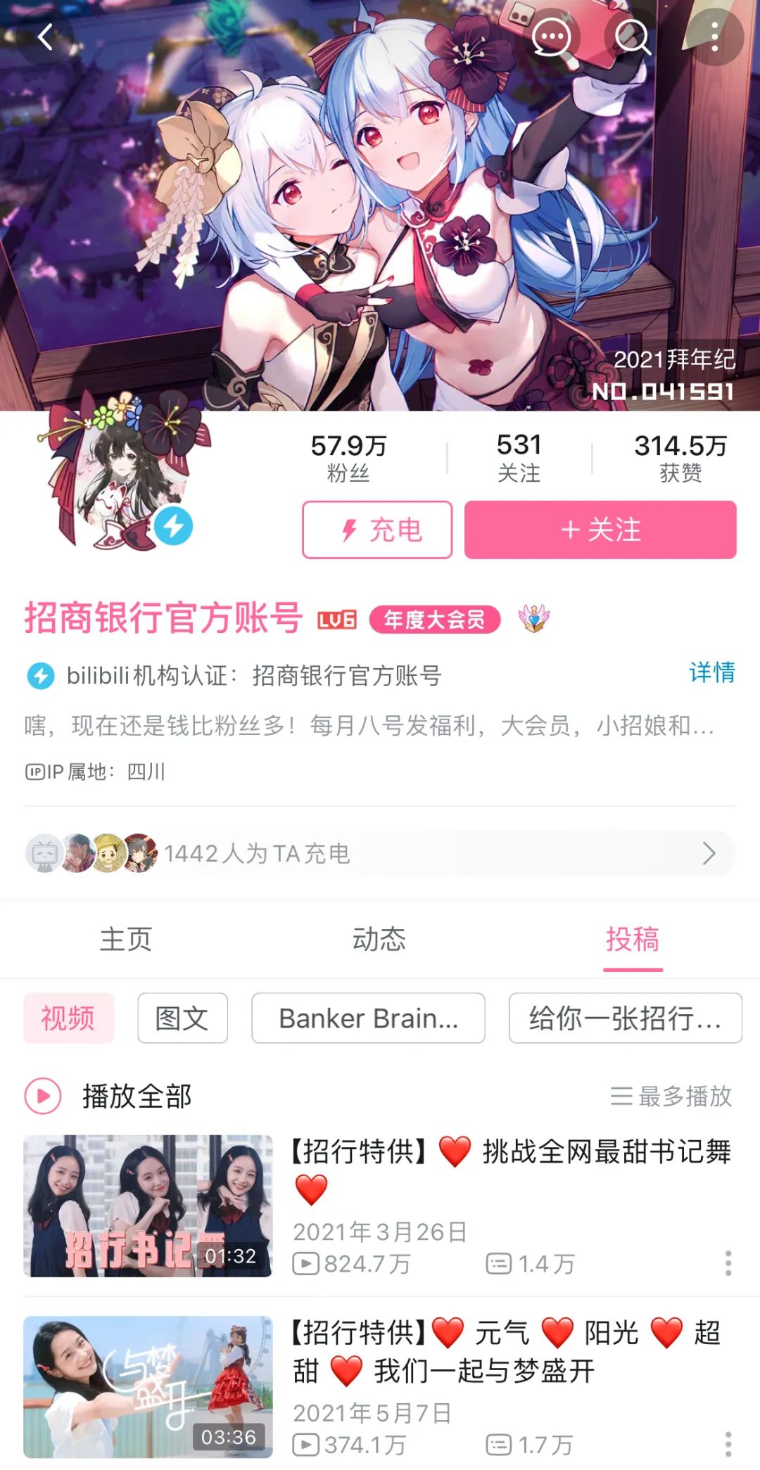 其中最出圈的,就有招商银行的“书记舞”。如今,招商银行官方账号在B站的粉丝已经有58.9万,首页热度最高的还是三年前的这支宅舞视频,播放量已经超过了800万次。