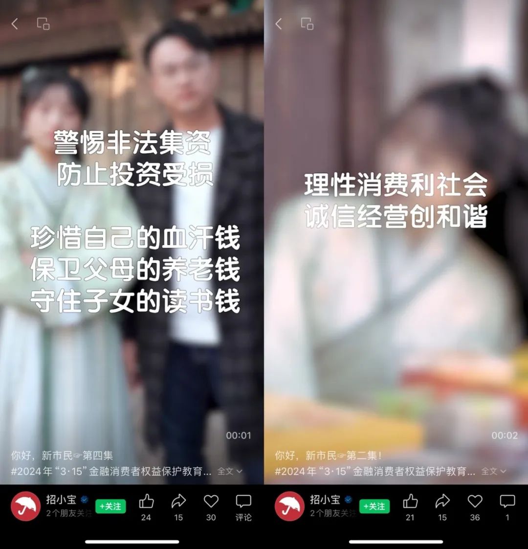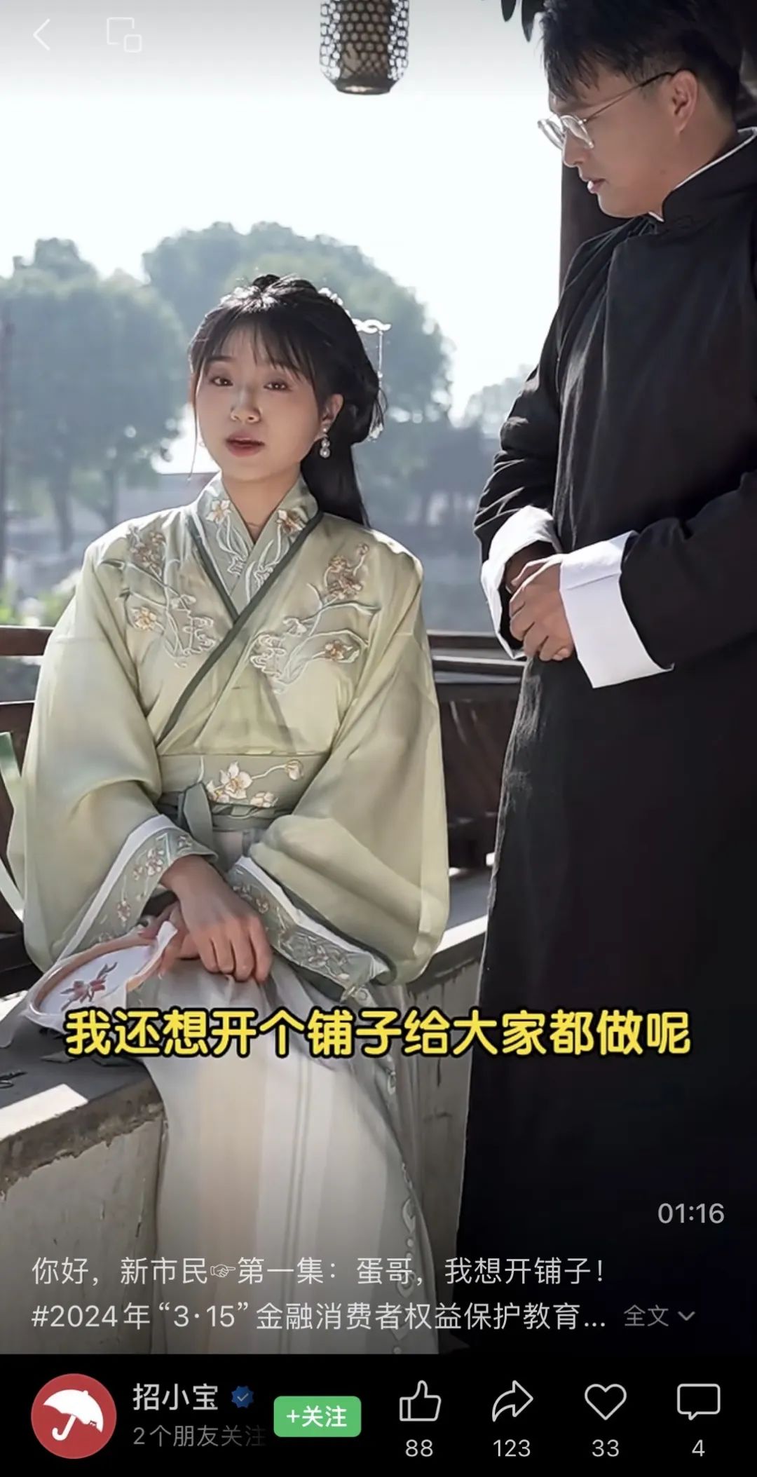 就拿招行来说,前两年凭借宅舞在B站上狂揽五十多万粉丝,今年为了博取流量继续整花活,比如315期间就在视频号“招小宝”上推出了系列小短剧《大小姐进城哉》。