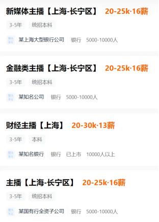 还有上海另一家某大型银行公司招聘“银行财经主播”,也给出了20k-30k·18薪的高薪。