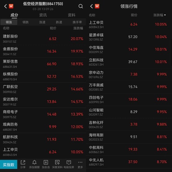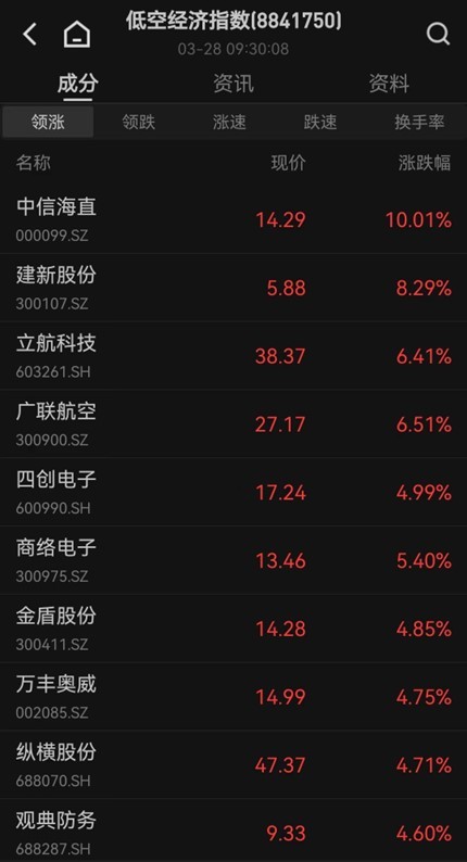 低空经济概念股高开高走,深城交、卧龙电驱、万丰奥威、中信海直、四创电子、立航科技、烽火电子等10余股涨停,金盾股份、莱斯信息等涨超10%。