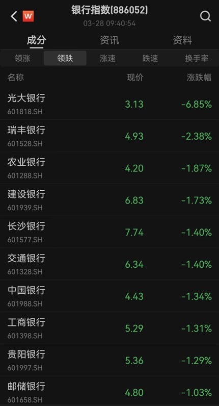 银行板块早盘下挫,光大银行跌超7%,瑞丰银行、农业银行、交通银行、工商银行、建设银行等跟跌。