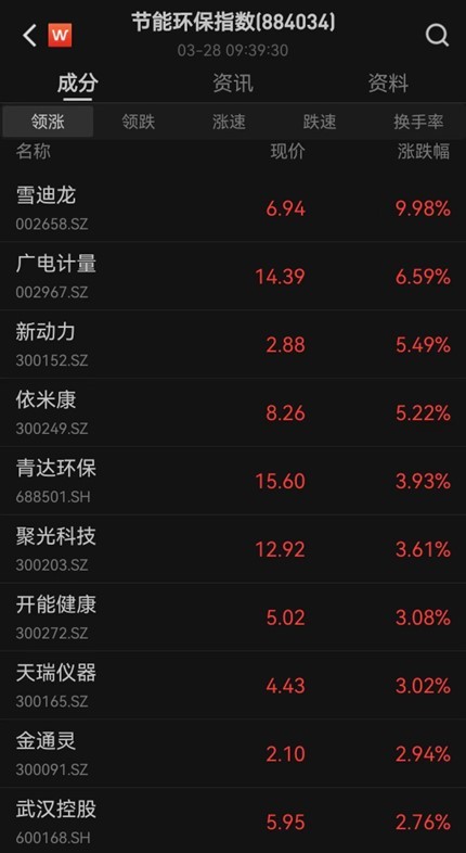 环保板块早盘拉升,雪迪龙涨停,复洁环保、聚光科技、青达环保、中兰环保、华控赛格等跟涨。