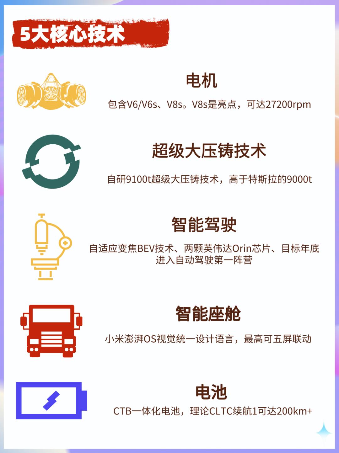 在去年12月技术发布会上,小米将压铸、电池一体化、电驱列入五大核心技术可以看出,小米的短板肯定是在一定程度上补齐了。