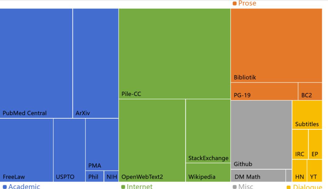 “大堆”(The Pile)各个数据来源的占比,Bibliotik部分就是最惹事的Books3数据集