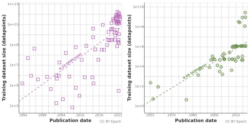 AI论文与模型的训练数据规模,从1955年的10的2次方,涨到2022年的10的13次方
