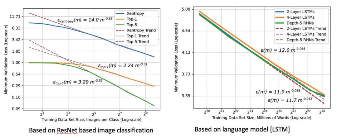 论文中关于“神经缩放定律”的呈现:训练数据规模指数级增加,最小损失值就显著减少