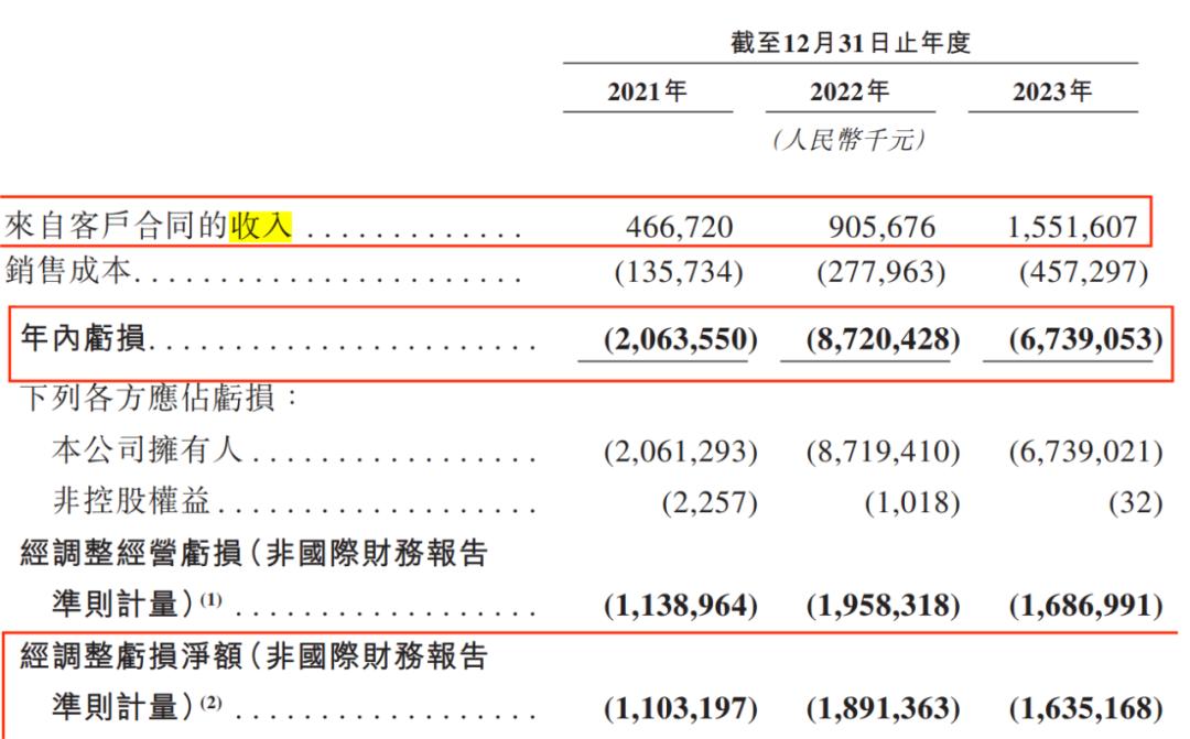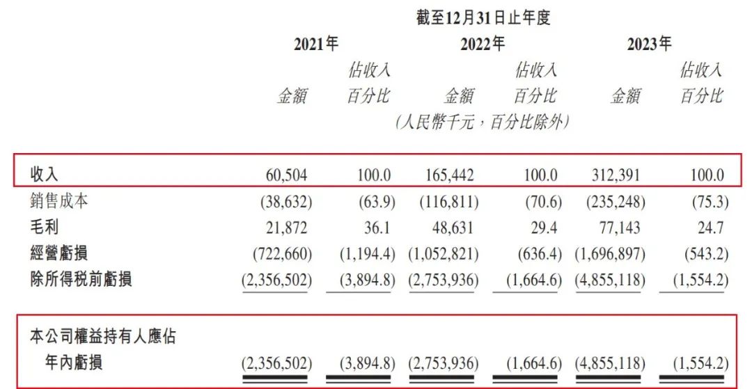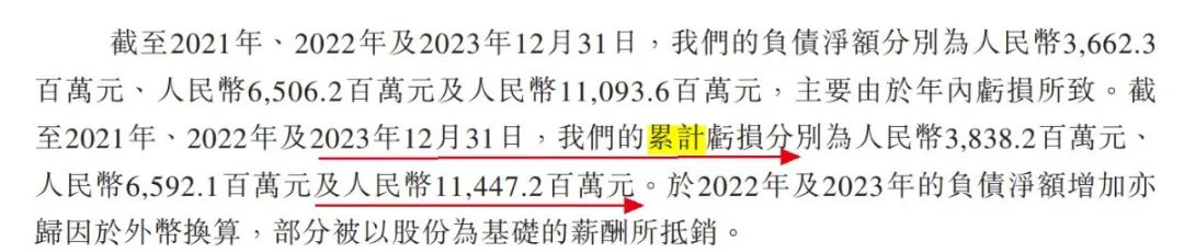 2021年-2023年,公司权益持有人应占亏损分别为23.57亿元、27.54亿元、48.55亿元。