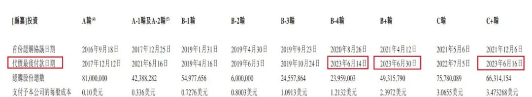 其中,B-4轮、B+轮、C+轮的最后付款日期为2023年6月。这也意味着,在收到这三笔投资款项后,10轮投资款均已到手。