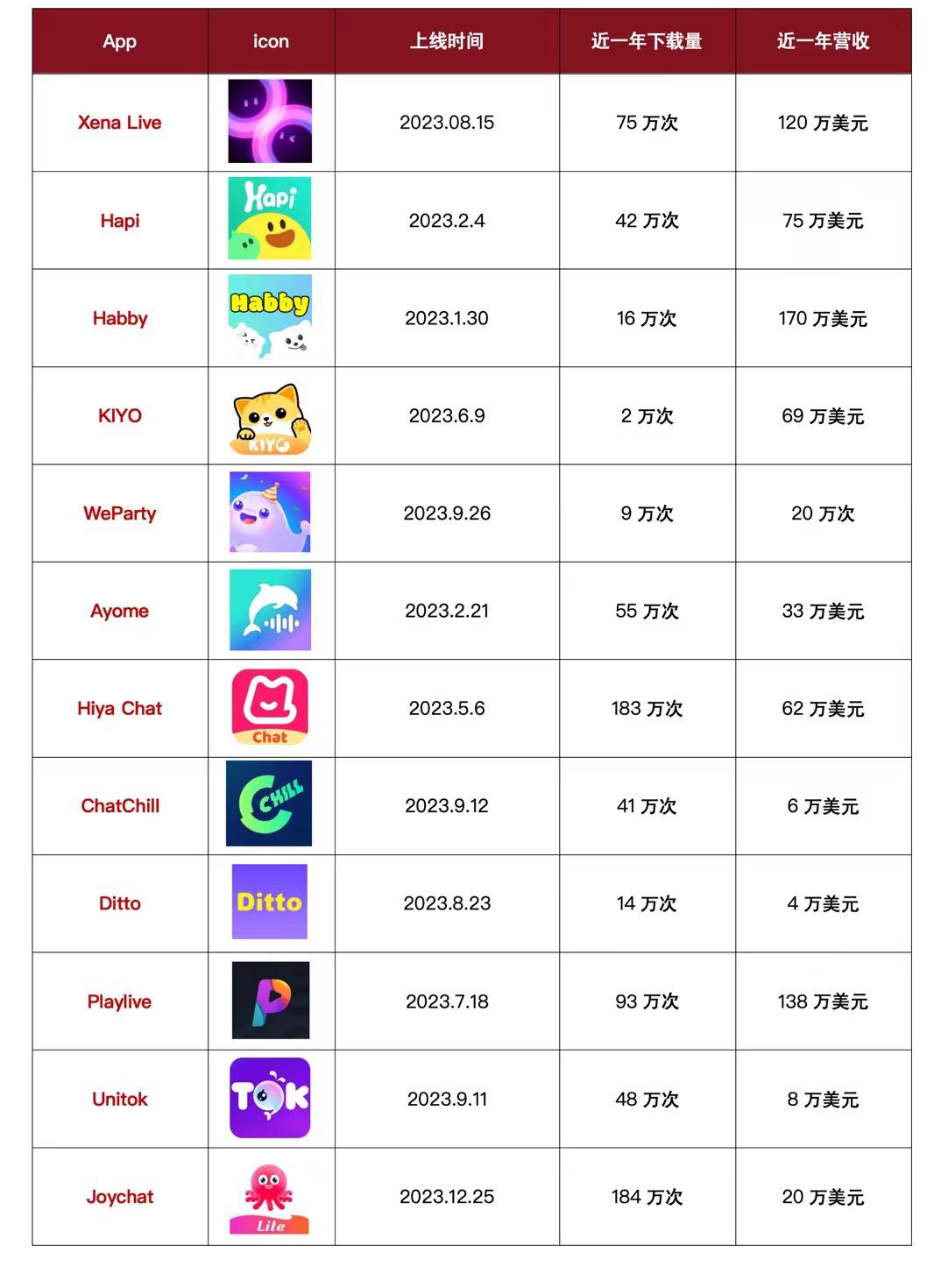 如果,我们将年营收 60 万美元设为准入门槛,共有 Habby、Playlive、Xena Live、Hapi、KIYO 和 Hiya Chat 等六款产品进入讨论范围,5 款为语聊产品,余下一款为陪聊产品。