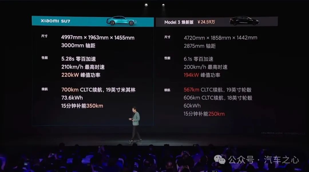 甚至在最后公布价格环节,小米 SU 7 拉来了 Model 3 焕新版所有配置来比,最终只有百公里电耗、智驾处理器两项没比得过特斯拉。
