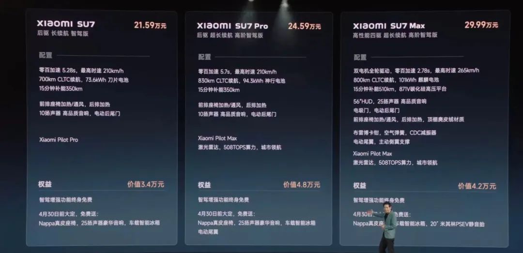 不过,对于这些免费送的权益,雷军也反复声明,只有4月30日之前大定的客户才能享有,“希望各位理解,送的越多,意味着我亏的越多。”