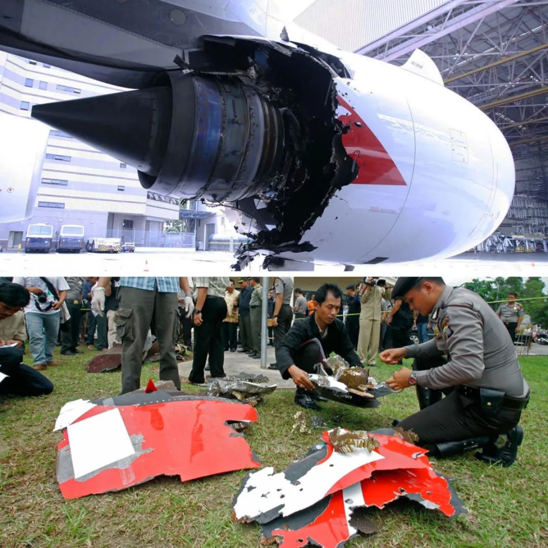 除了波音飞机,空客的A380飞机的引擎也曾发生故障,出现碎片掉落的情况,图片来源:Australian Transport Safety Bureau