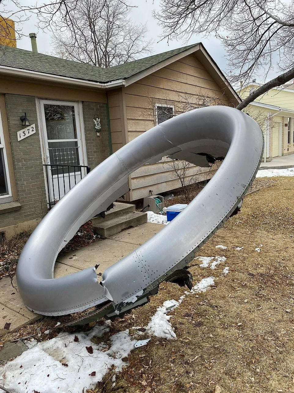 其他发动机碎片也散落在各个地方。有位居民当时正在家里做三明治,结果一个发动机碎片穿过他家屋顶穿过,砸进厨房,就落在离他半米远的地方。