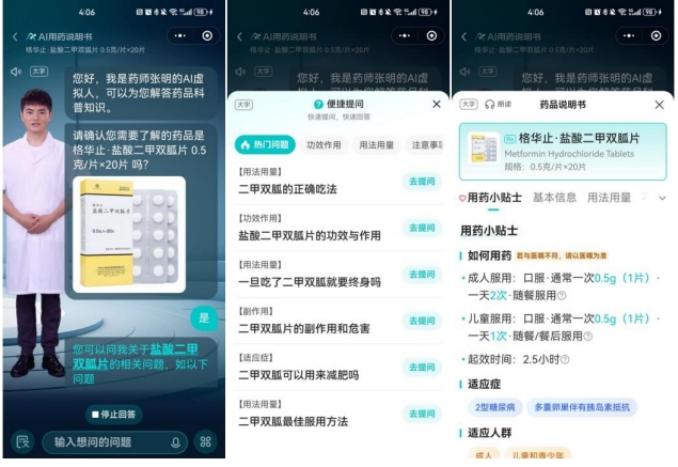 借助文心大模型和数字人技术,用户可以和数字人药剂师实时交互,有效解决了纸质版说明书看不清、看不懂以及字太小的痛点。此外,3.0版本的AI用药说明书新增用药提醒功能,用户可以设置用药时间和提醒方式。