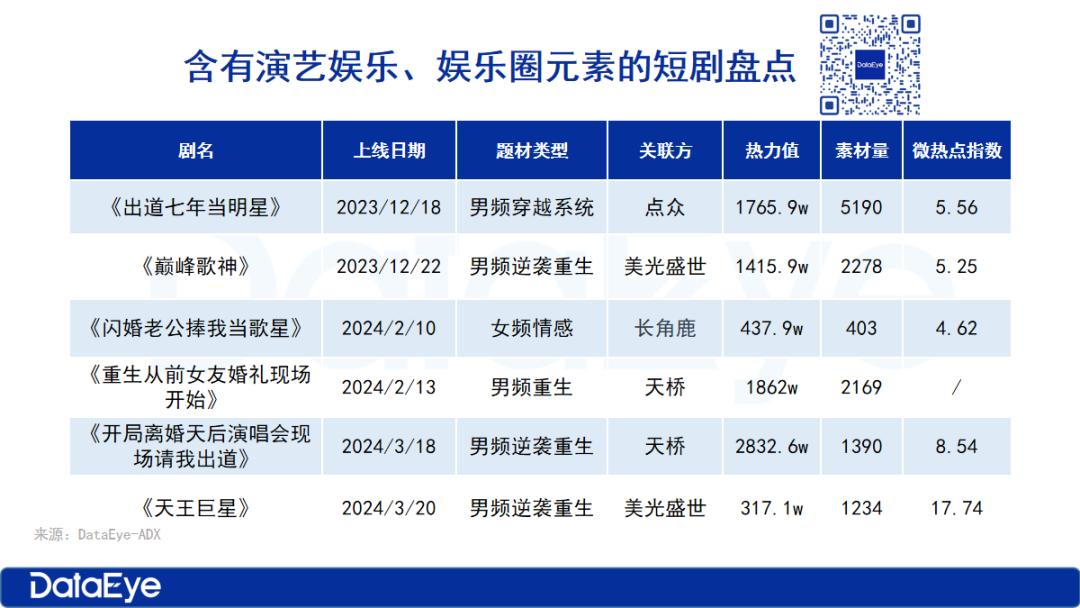 本文选取六部含有演艺娱乐、娱乐圈元素的短剧,从题材类型、关联方、热力值等方面进行分析。