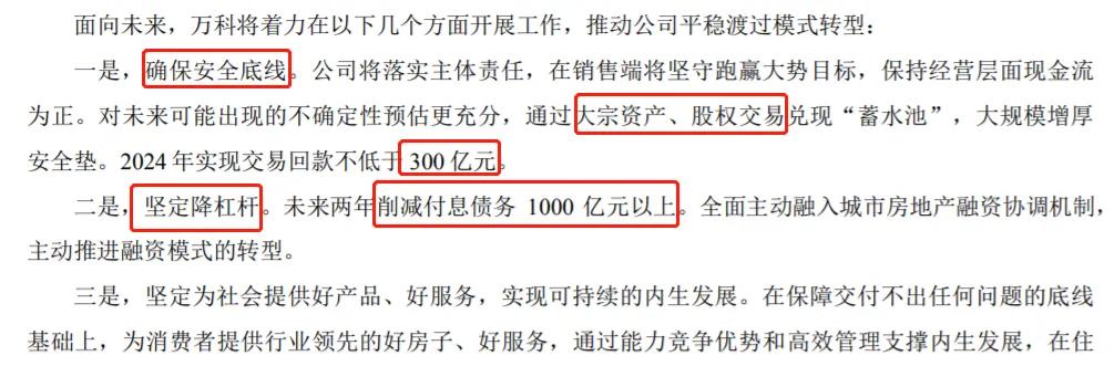 年报显示,为应对2024年债务风险,万科将采取3大针对性专项行动, 比如通过大宗资产股权交易等实现交易回款不低于300亿,比如未来两年拟削减付息债务1000亿元, 系统化解万科财务风险。