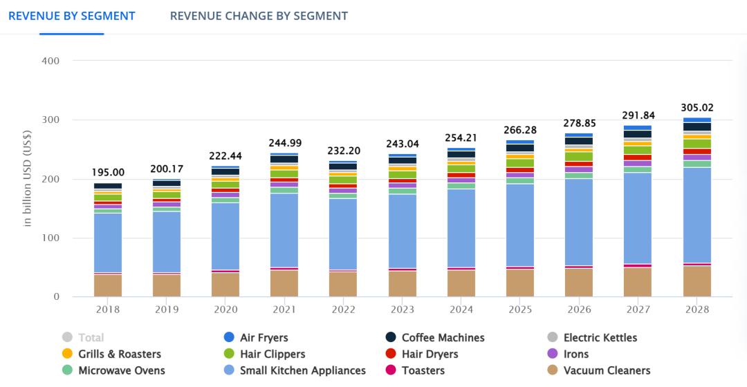 在这一切的背后,全球智能家居市场规模的持续增长为小家电品牌出海提供了前所未有的机遇。根据Statista数据,2023年全球小家电市场规模达到2430亿美元,预计到2028年将达到3050亿美元。
