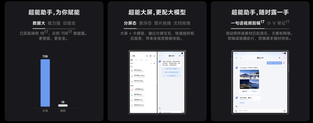 首先是将蓝心小V以原生系统级应用的身份植入手机,提供语义搜索、超级智慧交互、超级写作、超级问答、超级创图在内的五种功能。相对而言,OPPO也是在系统内嵌入了小布AI,支持Find N3。