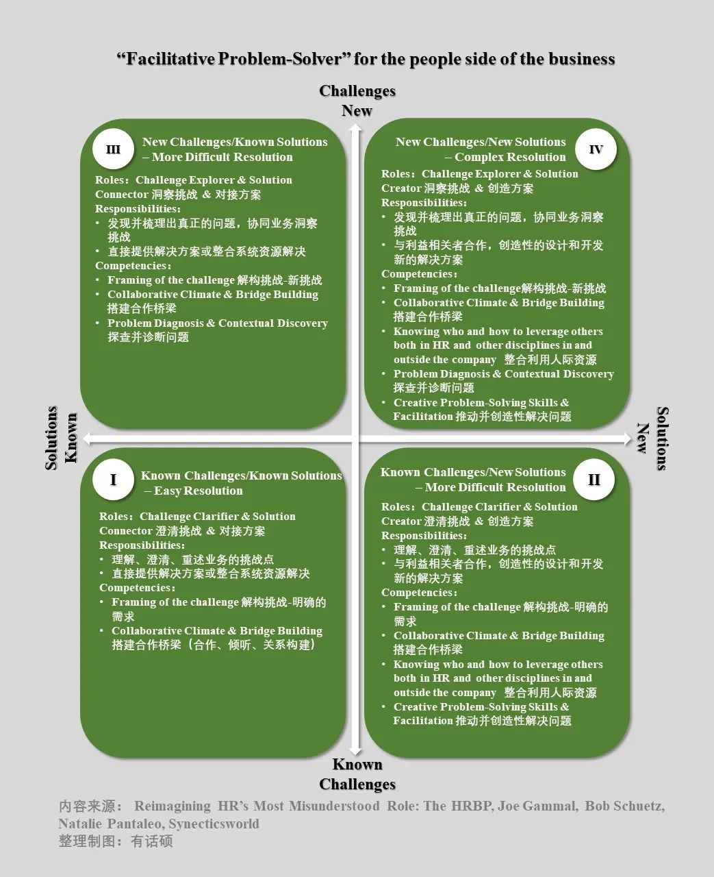 这个模型实际上把 HRBP 定位成了应对挑战和解决问题的桥梁。如果我们把挑战分为已知的挑战和未知的新挑战;解决方案分为现有的方案和需要创造的方案,就得出了四个不同的象限,包括: