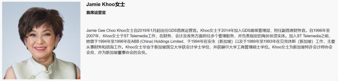 在融资公布的同一天,GDS国际也宣布了一项任命——现任万国数据COO(首席运营官)邱仪珠(Jamie Khoo)将调任为GDS国际的CEO,本轮融资完成后生效,邱仪珠原来的工作将分配给其他高管。