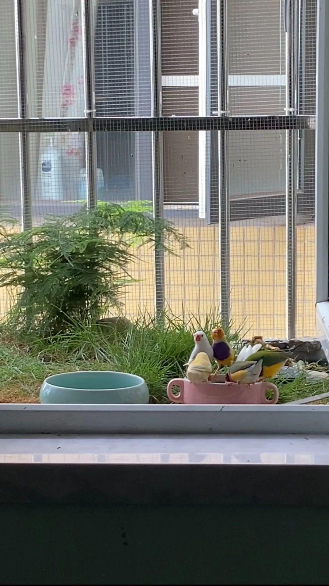从窗户伸展出去的、被防盗栏围住的不到一平米的空间,被他改造成了一个生态鸟笼:鸟笼下方铺满了绿色的草皮和石子,左侧插着文竹、小叶榕和麦冬草,右侧则建着一个手提箱大小的池塘,里面还有几条游动着的鱼,看起来就像是一个微型花园。五颜六色的鸟,在这块小绿洲上空栖息着,白毛黄嘴的、绿身红脸的、灰白相间的,几只在鸟架上站着,几只躲进苇草编织的窝里,还有几只呆不住的,挥着翅膀飞来飞去。