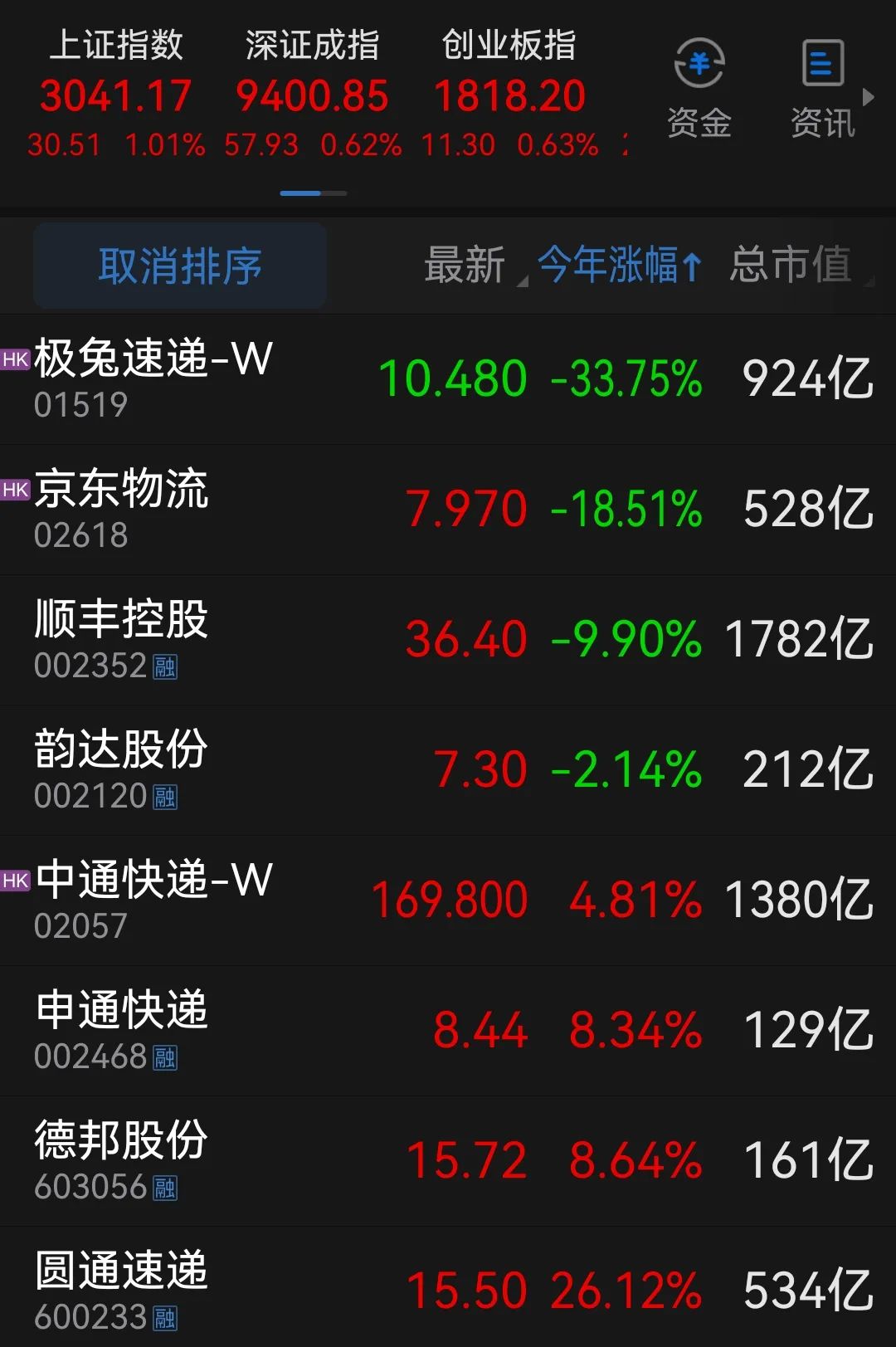 不过,快递股价近期走势并不乐观,顺丰与极兔近段时间持续下跌,今年以来极兔累计下跌超30%,顺丰下跌10%,中通在下跌一年后近期持续回温,市值上涨至1400亿港元区间。