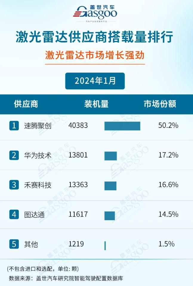 数据显示,2024年1月,速腾聚创车载激光雷达装机量高达40,383台,市场份额达到50.2%,远超华为、禾赛等竞争对手,再次领跑全球市场。结合当下市场需求的高景气度,预期速腾聚创在2024年有很大概率维持这种高速增长。