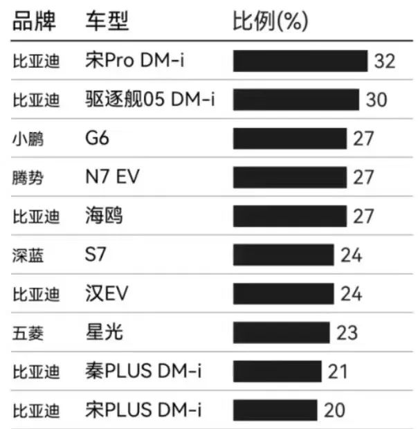 约有13%新能源车主使用小米手机。其中,比亚迪宋Pro DM-i、比亚迪驱逐舰05 DM-i收获了最多“米粉”——两款车型的起售价分别为10.98万元和7.98万元。排名第三至第十的车型价位分布则较为分散。