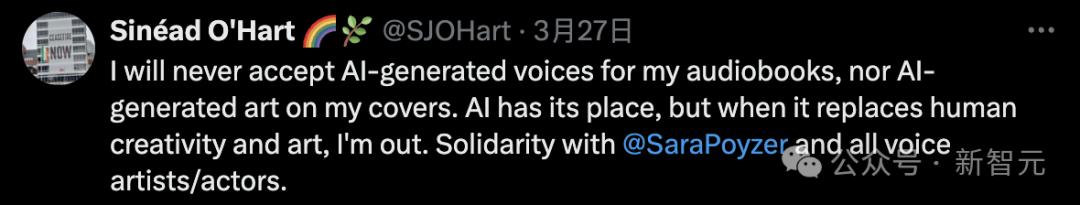 「我永远不会接受AI生成的声音出现在我的有声读物中,也不会接AI生成的艺术出现在我的封面上。人工智能有它的用武之地,但当它取代人类的创造力和艺术时,我就不干了。声援@SaraPoyzer和所有配音艺术家/演员。