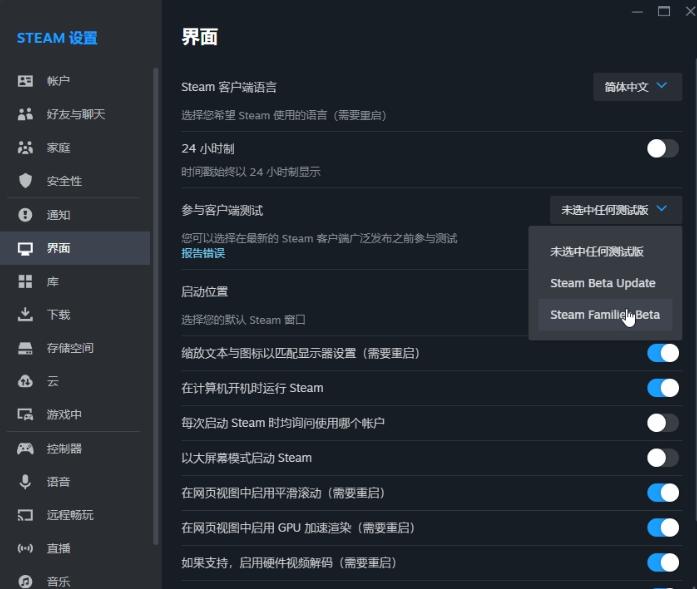 目前这个功能还在测试阶段,想要使用的话,我们需要在 Steam 设置 - 界面 - 参与客户端测试中,选中 Steam Families Beta ,然后重启客户端。