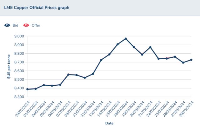 3月份以来全球铜价持续走高,3月16日,国际铜价(LME铜)一度上破至9000美元/吨关口;截至当前,国际铜价依然超过8700美元/吨。