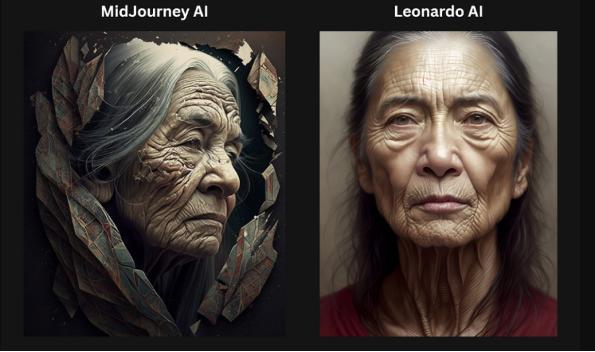 比如,下图中的两位老太太,Midjourney生成图像偏向抽象类油画类艺术创作,Leonardo生成的图像在自然光线下更加真实。