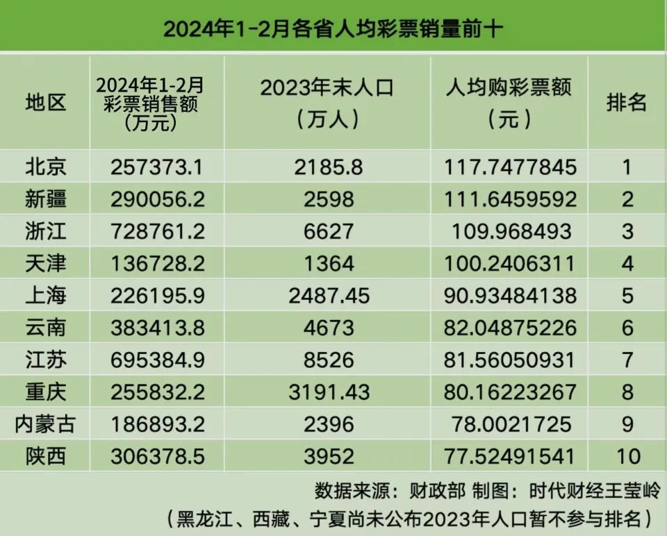 若要比较哪里的人最爱买彩票,还是要以人均购彩金额(注:各省福利彩票人均销售额=各省福利彩票销售额/各省年末常住人口)进行比较。