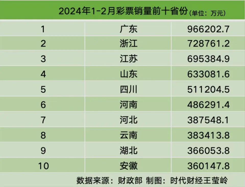 从今年前2月购买彩票的总额来看,有5个省份彩票销量超50亿,依次为广东(96.62亿元)、浙江(72.88亿元)、江苏(69.53亿元)、山东(63.3亿元)和四川(51.12亿元),这五个省份,也是2023年全年GDP前五的省份。