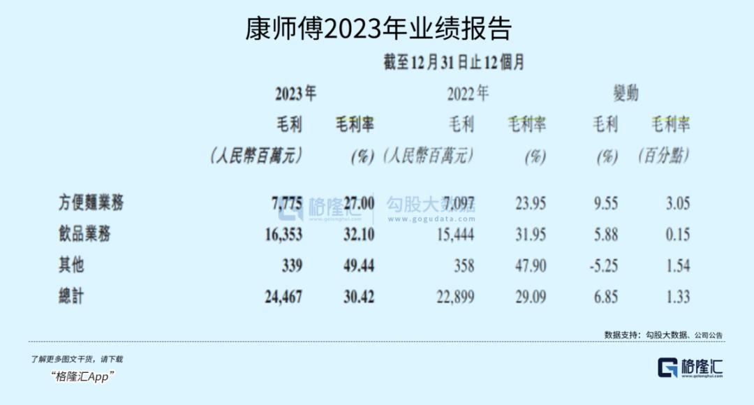 从康师傅的饮品业务来看,饮品的毛利水平远高于方便面,2023年康师傅饮品业务毛利率为32.1%,而方便面毛利率为27%。